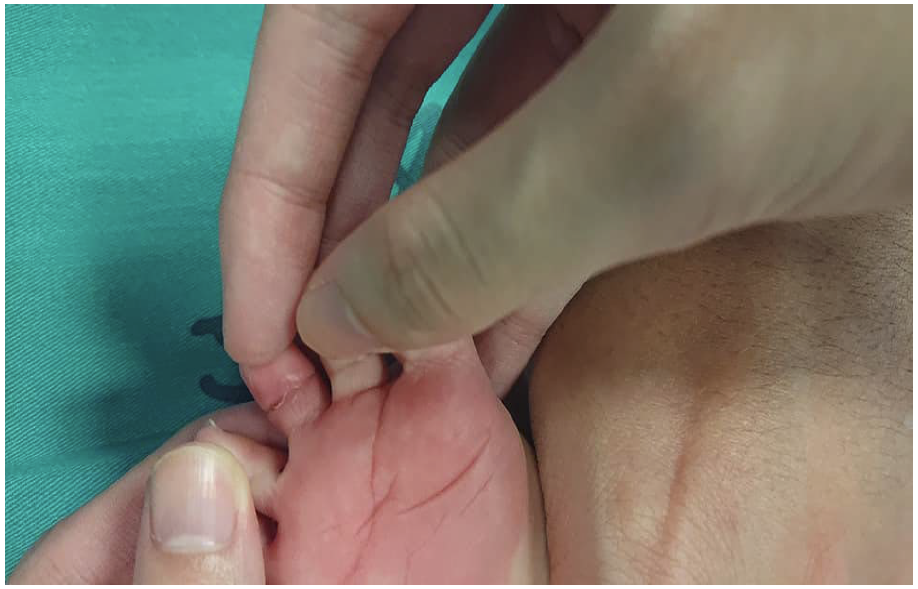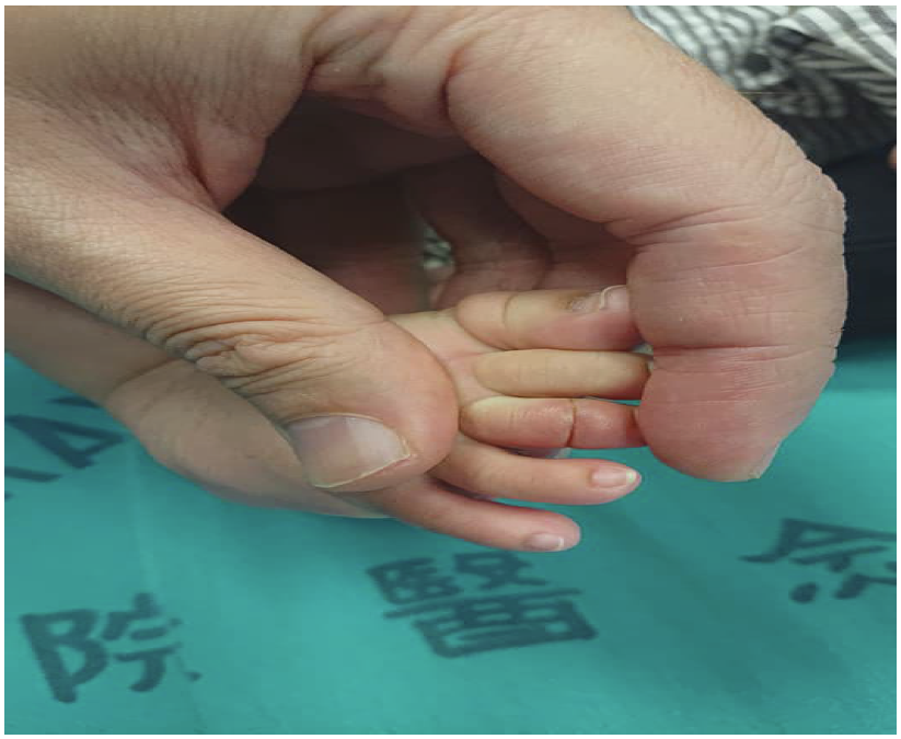 圖三 討論 嬰兒哭鬧不休對急診醫師來說是個困難的主訴,哭鬧原因可能從肚子餓、輕微的脹氣、腸絞痛到嚴重致命的腸阻塞、腦炎等多樣原因。幼兒因為無法準確的表達自己的不舒服,須靠醫師經由詳細的病史問診和理學檢查來找出正確的病因。 首先要排除病童是否是因為肚子餓或想要換尿布的而造成的哭鬧。新手家長有時對於照顧幼兒的經驗不足,醫師可以試著抱起小孩輕微搖晃,嘗試能否安撫。 病史詢問要包含過去病史、最近幾餐的奶量有無明顯減少、由無發燒、有無活動力下降、有無其他伴隨的呼吸道或腸胃道症狀等。理學檢查容易忽略的是沒有把尿布打開來做檢查,要確認有無腹股溝疝氣、包皮嵌頓或睪丸異常腫大,而觀察全身有無傷口或組織紅腫也很重要,無法解釋的瘀青或骨折都要積極懷疑兒虐的可能性。 頭髮止血帶症候群(hair torniquet syndrome),是個罕見的兒科急症,好發於五個月以下嬰兒,主要原因是肢體末端(手指、腳趾、陰莖)被頭髮或細線纏繞導致。濕的頭髮柔軟容易伸展,但乾燥後會收縮變緊,所以纏繞組織器官後會產生類似止血帶的作用,阻礙淋巴及靜脈回流,導致水腫。時間一久,毛髮持續收緊,隱藏在水腫的組織內,更難被發現,造成診斷的困難。久了甚至會影響到動脈供血,造成遠端組織缺血壞死。 頭髮止血帶症候群的危險因子包含媽媽產後容易掉髮,因為賀爾蒙失調,產後到六個月大是媽媽掉髮的高峰,也和頭髮止血帶症候群好發的年紀相重疊。 頭髮止血帶症候群的治療需在確診後盡早移除纏繞的毛髮,國外報告使用含thioglycolate的除毛劑效果不錯。也可以用鑷子夾出,或用探針或刀片將毛髮切斷後移除。如果遇到毛髮卡入太深層的,可考慮進行縱向手術切口來取出。 結論 嬰兒哭鬧對急診醫師一直以來都是個挑戰,需仰賴醫師仔細的評估來做出診斷。頭髮止血帶症候群是個急症,早期的診斷和治療可以得到良好的預後。 參考文獻 1.Hair tourniquet syndrome: revisited. Hussin P, Mawardi M, Masran MS, Ganaisan P. G Chir. 2015;36:219–221 2.Hair-thread tourniquet syndrome; emergent diagnosable condition. Tavallaei AH. Arch of Pedia Surg. 2022;6:124–128. |