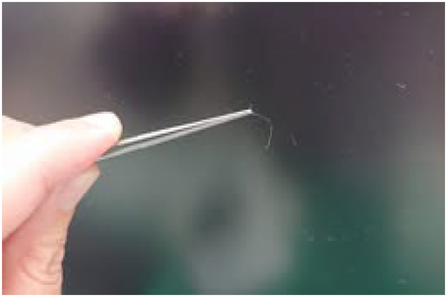 圖一 ![]() 圖二 因為高度懷疑這個是頭髮止血帶症候群,但目視下又沒有看到有任何頭髮或線卡在裡面。於是會診小兒外科,經小兒外科醫師用鑷子探查,果然於凹陷處取出三根白頭髮(圖三),取出後病人腳指紅腫慢慢恢復,病人後續門診追蹤預後良好。