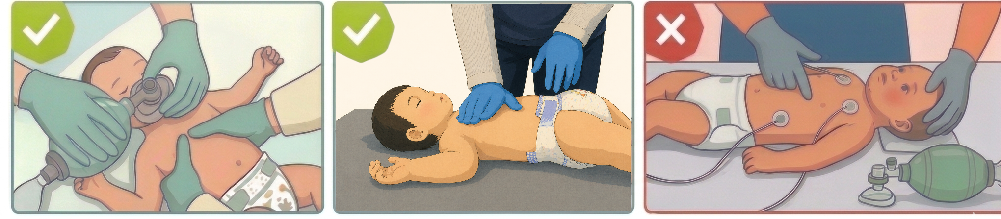 圖三、嬰兒壓胸:建議雙拇指環抱法(左圖)與單掌法(中圖),刪除兩指法(右圖) Take Home Message 7:小兒通氣建議2-3秒給一口氣 一個多中心觀察性研究顯示,在已有進階呼吸道且正在接受CPR的小兒患者,給予嬰兒≥30次/分、兒童≥25次/分的通氣頻率與較佳的ROSC、出院存活率及神經預後相關。因此建議對於有脈搏但無正常呼吸或已有進階呼吸道且CPR中的小兒患者,應每2–3秒給1次呼吸(約20–30次/分鐘)。 Take Home Message 8:穿戴個人防護裝備不影響CPR品質但可能增加疲勞 雖然CPR會產生氣溶膠,但1篇系統性回顧與17篇假人模擬的研究顯示,穿戴個人防護裝備(Personal Protective Equipment, PPE)對患者存活率及CPR操作品質並無顯著影響,但部分研究發現會增加施救者疲勞程度。 Take Home Message 9:電極貼片位置規範與調整女性胸罩位置 成人電極貼片可採四種位置(anterolateral、anteroposterior、anterior-left infrascapular、anterior-right infrascapular),其電擊成功率相近 。兒童則以anterolateral或anteroposterior為主,確保貼片不重疊。 研究顯示女性在公共場所接受AED去顫的機率顯著低於男性,可能是因施救者對暴露女性胸部感到不適,或擔心被指控不當觸碰有關;動物實驗亦顯示,即使貼片置於胸罩金屬絲線上仍可有效電擊且無燒傷等不良事件。因此建議優先調整胸罩位置來貼附電極在皮膚上,而非整個移除胸罩。 若現場無手動電擊器或具兒童衰減器之小兒AED,仍可使用成人AED於嬰幼兒,因去顫電擊為可電擊心律唯一有效治療,及早電擊方可挽救生命。