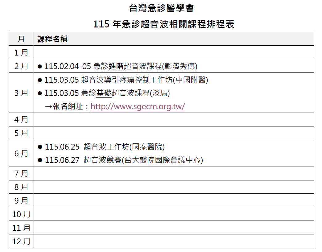 【台灣急診醫學會】115年急診超音波相關課程排程表 (115.01.06更新),請自行下載。